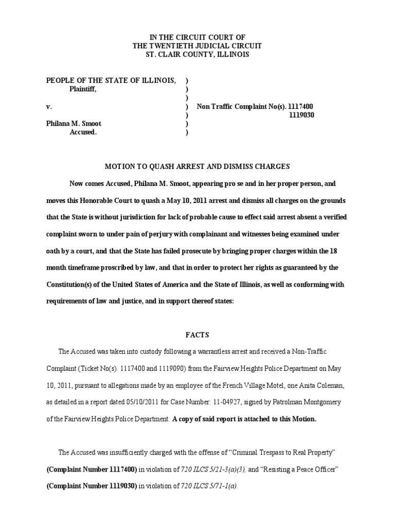 Philana Smoot Motion To Quash Arrest And Dismiss Charges
