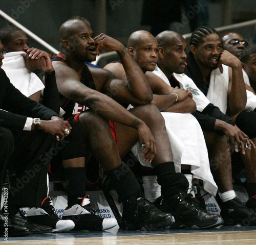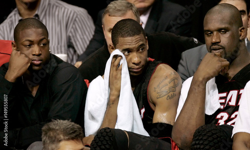Miami Heat Players Wade Butler And Oneal Sit On The Bench